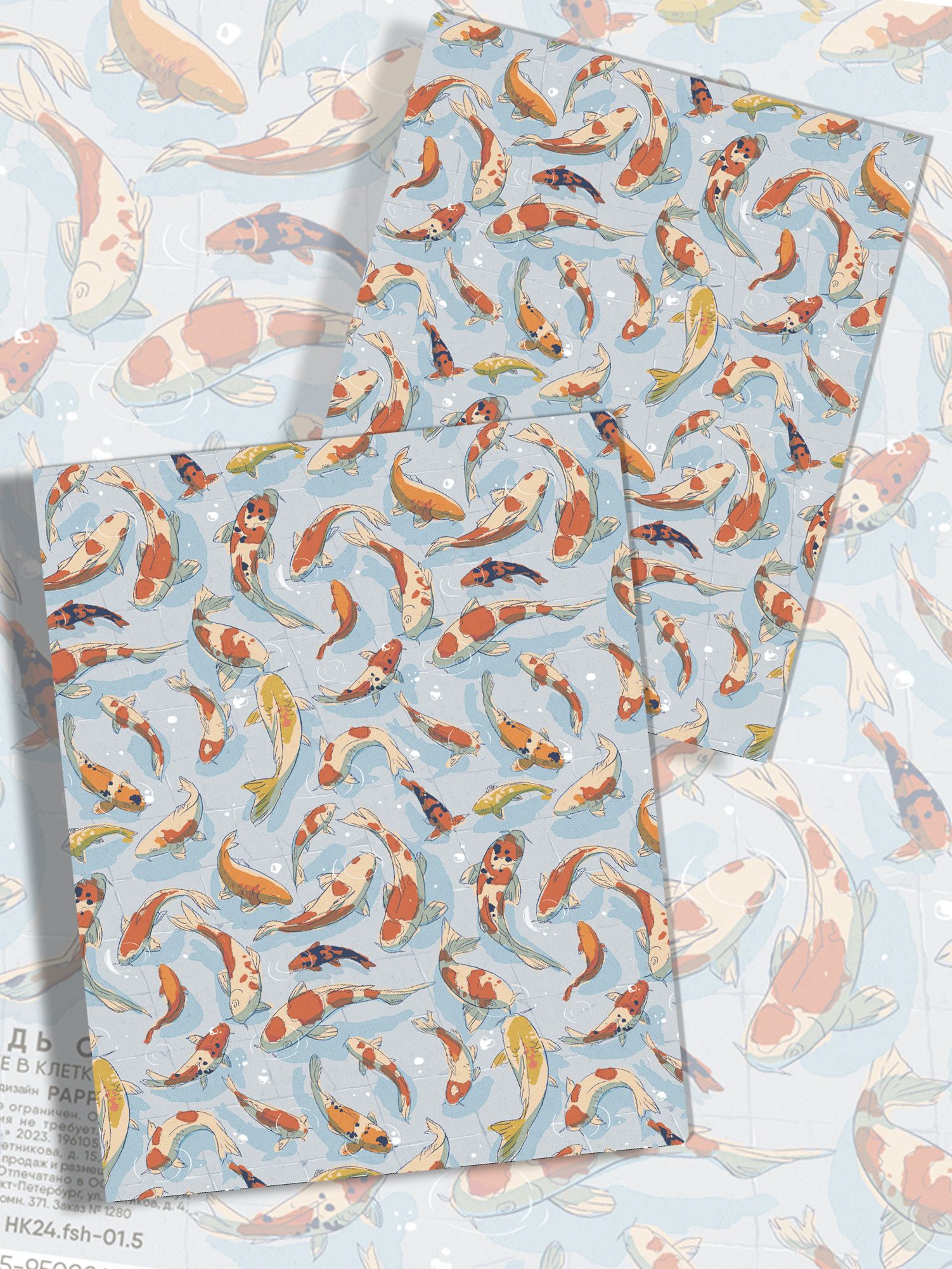 Разнообразие дизайнов: Набор содержит 5 уникальных дизайнов, вдохновленных разнообразием японских рыб. От изящных золотых карасей до таинственных кои – каждая тетрадь является неповторимым произведением искусства.