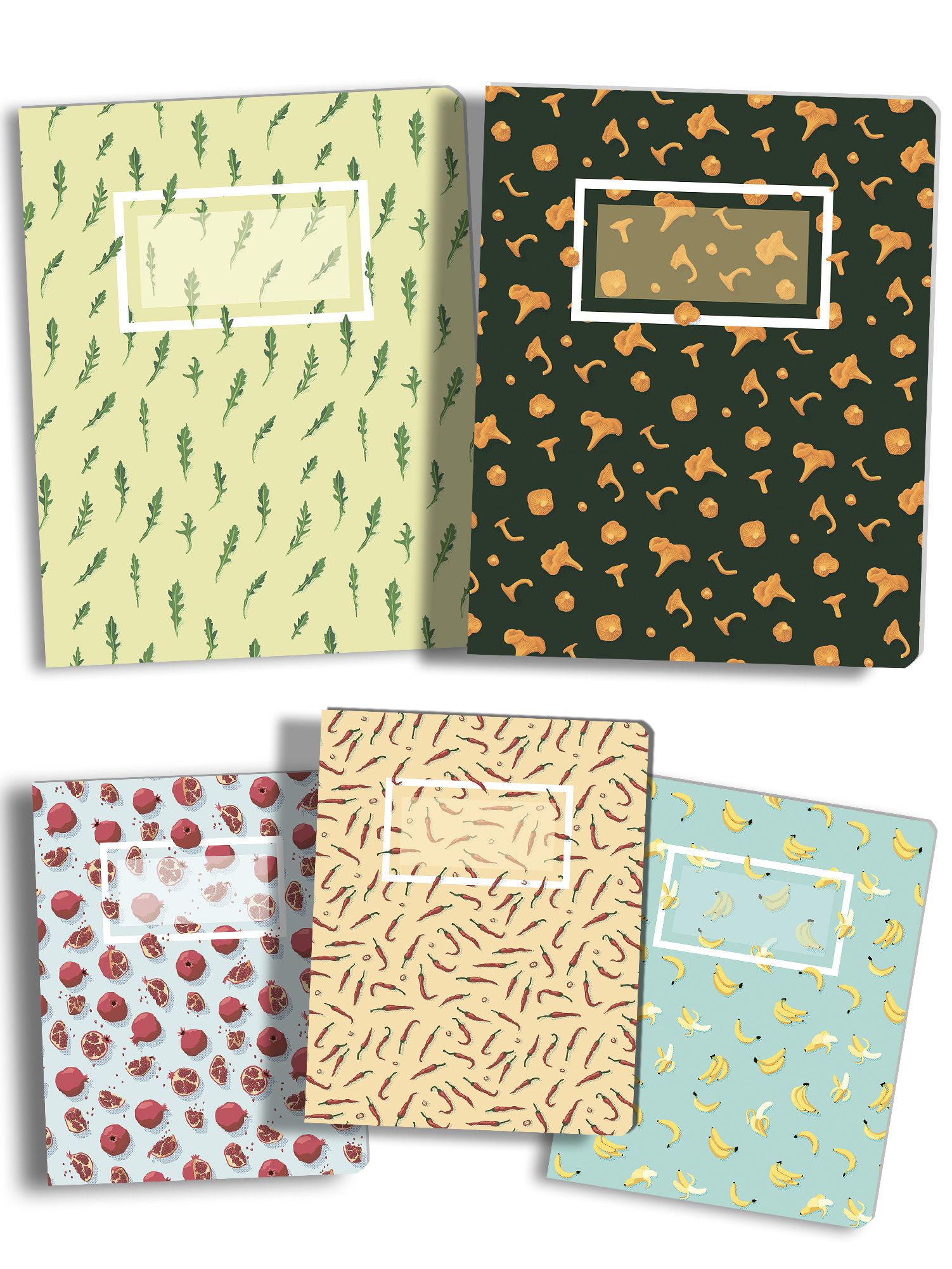 Многообразие дизайнов: Этот набор включает в себя 5 тетрадей формата А5 с уникальными фруктово-овощными дизайнами: Руккола, Лисички, Перчик, Банан, Гранат. Каждая тетрадь станет не только практичным инструментом для ваших записей, но и стильным аксессуаром.