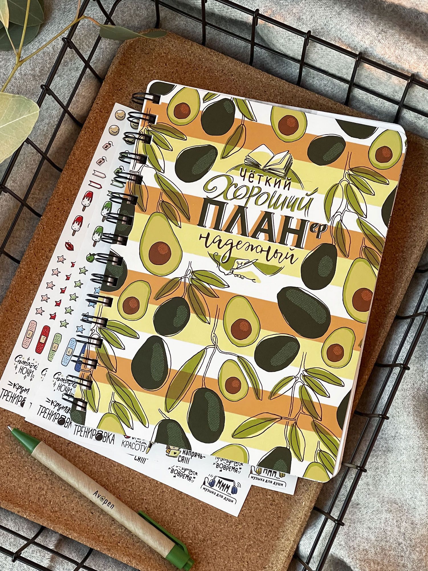 Дизайн с авокадо на обложке: Обложка с авокадо придает ежедневнику особый характер и становится знаковым элементом надежности и креативности.